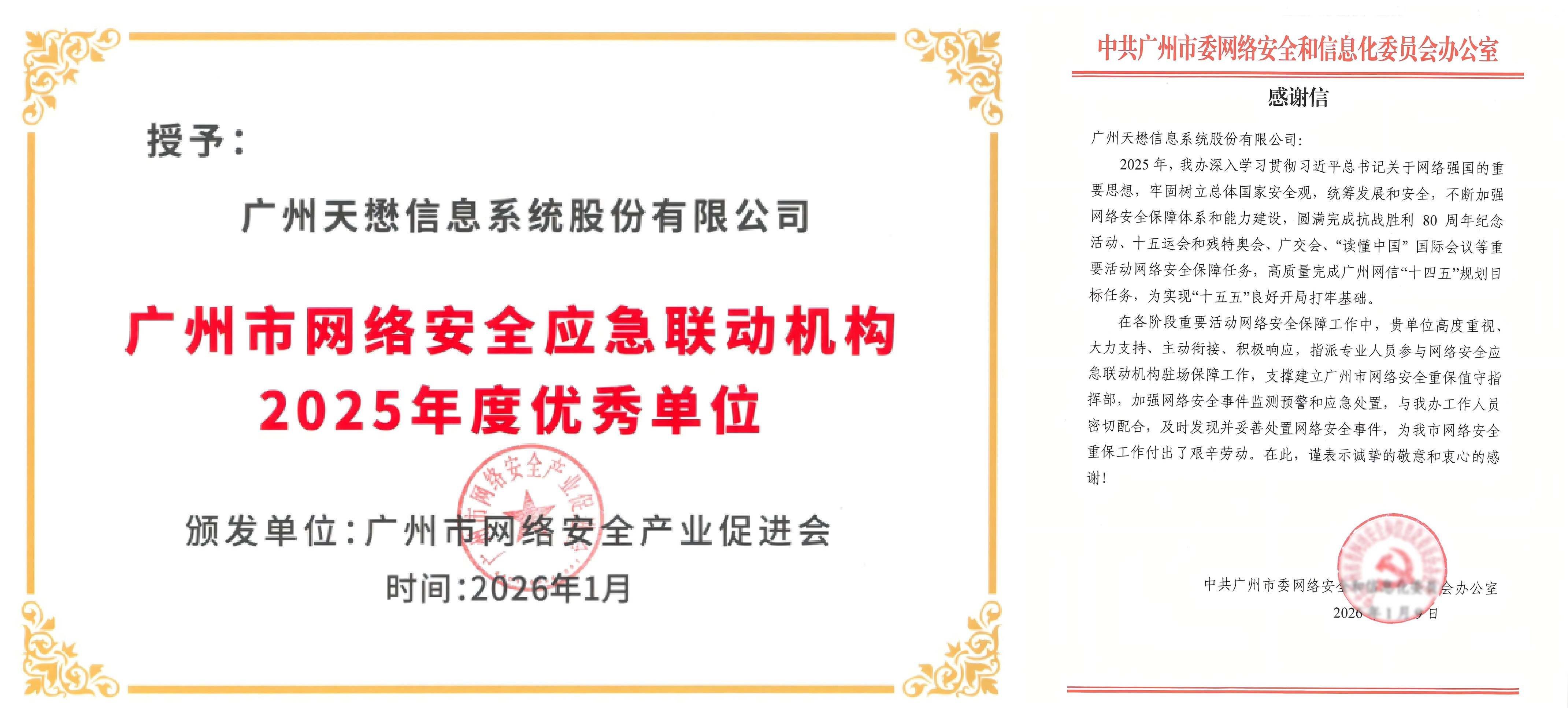 近期,天懋信息在专网安全领域的突出贡献广受政府单位及行业协会好评,捷报频传。为配合高质量完成广州网信“十四五”规划目标任务,天懋信息高度重视重大活动网络安全保障工作,积极提供专业技术支持,因此收到中共广州市委网络安全和信息化委员会办公室(以下简称“广州市网信办”)发来的感谢信。同时,在广州市网络安全应急联动机构2025年度考核中,公司经综合评审荣获“广州市网络安全应急联动机构2025年度优秀单位”。此外,公司凭借在行业协作与生态建设中的积极贡献,获广东省网络空间安全协会“感谢状”荣誉致谢。
